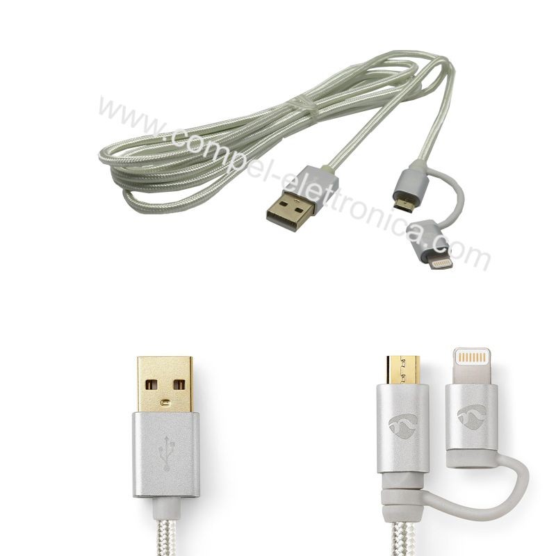 Descrizione: Cavo USB 2.0 Spina USB-A maschio con connettore Apple Lightning a 8 pin A Spina USB Micro-B maschio 480 Mbps 2.00 mt Connettori placcati oro Cavo Tondo Intrecciato Alluminio