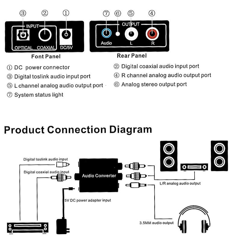 Descrizione: Convertitori attivo di segnale, converte un segnale audio stereo coassiale o toslink IN FIBRA OTTICA SPDIF in un segnale stereo analogico 2 RCA L/R e JACK 3,5mm Stereo.