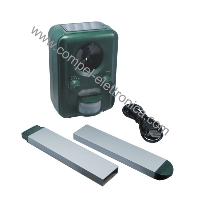Dotato di pannellino solare per la ricarica delle batterie e sensore PIR, questo dispositivo waterproof consente di allontanare cani, gatti, topi, volpi, uccelli e piccoli roditori, grazie al segnale acustico e alla luce strobo che è in grado di generare. Quando il sensore ad infrarossi PIR rileva il movimento di un animale, il dispositivo attiva simultaneamente una luce strobo e genera un segnale acustico in modo continuo con frequenza variabile da 13.500 a 23.500 Hz. Dispone di regolazione della sensibilità del sensore PIR, selettore per la scelta della modalità di funzionamento (interruttore, lampeggiante e vari range di frequenze ad ultrasuoni a seconda dell'animale da allontanare).