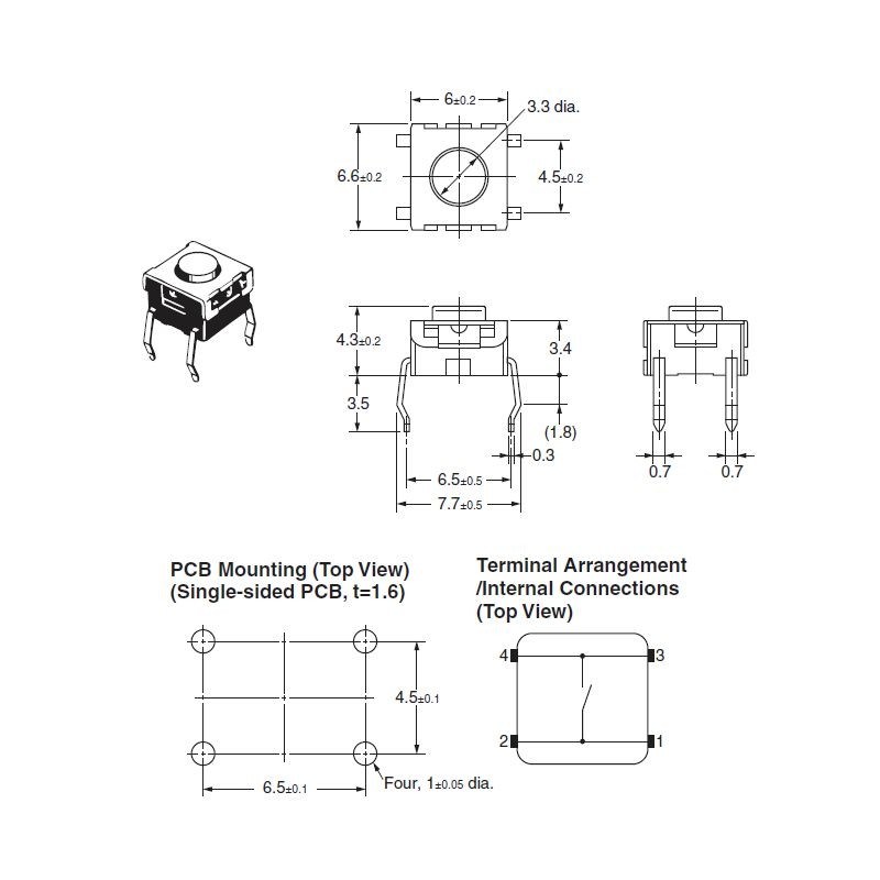 MINI PULSANTE 4 PIN C.S. 6X6X4,3H FORZA TASTINO 2,25N