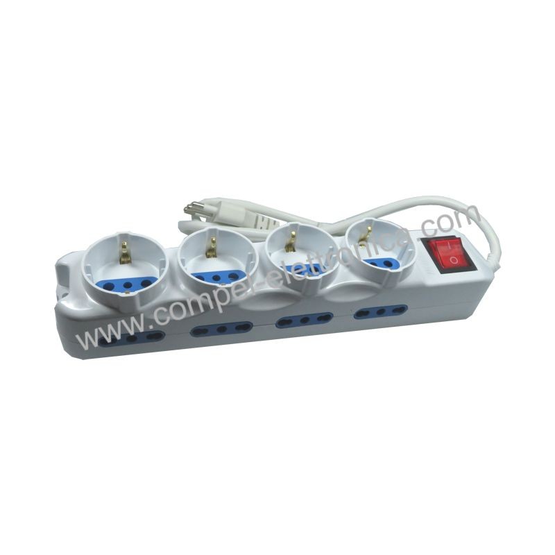 Descrizione: Presa multipla a 4 prese italiane bipasso 10/16A più Schuko con massa laterale più 8 prese bipasso con interruttore generale. Prese bipasso/schuko con alveoli di sicurezza schermati,con interruttore generale luminoso rosso Spina italiana: 16A