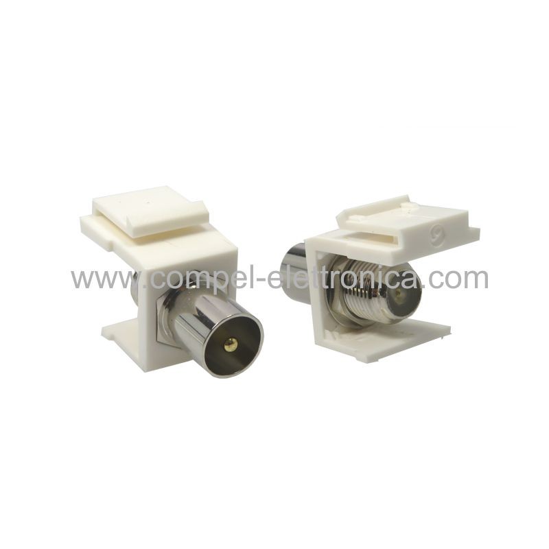 Descrizione: Adattatore da spina coassiale a presa F con custodia in plastica per poterlo utilizzare sulle placche a muro e frutti KEYSTONE.